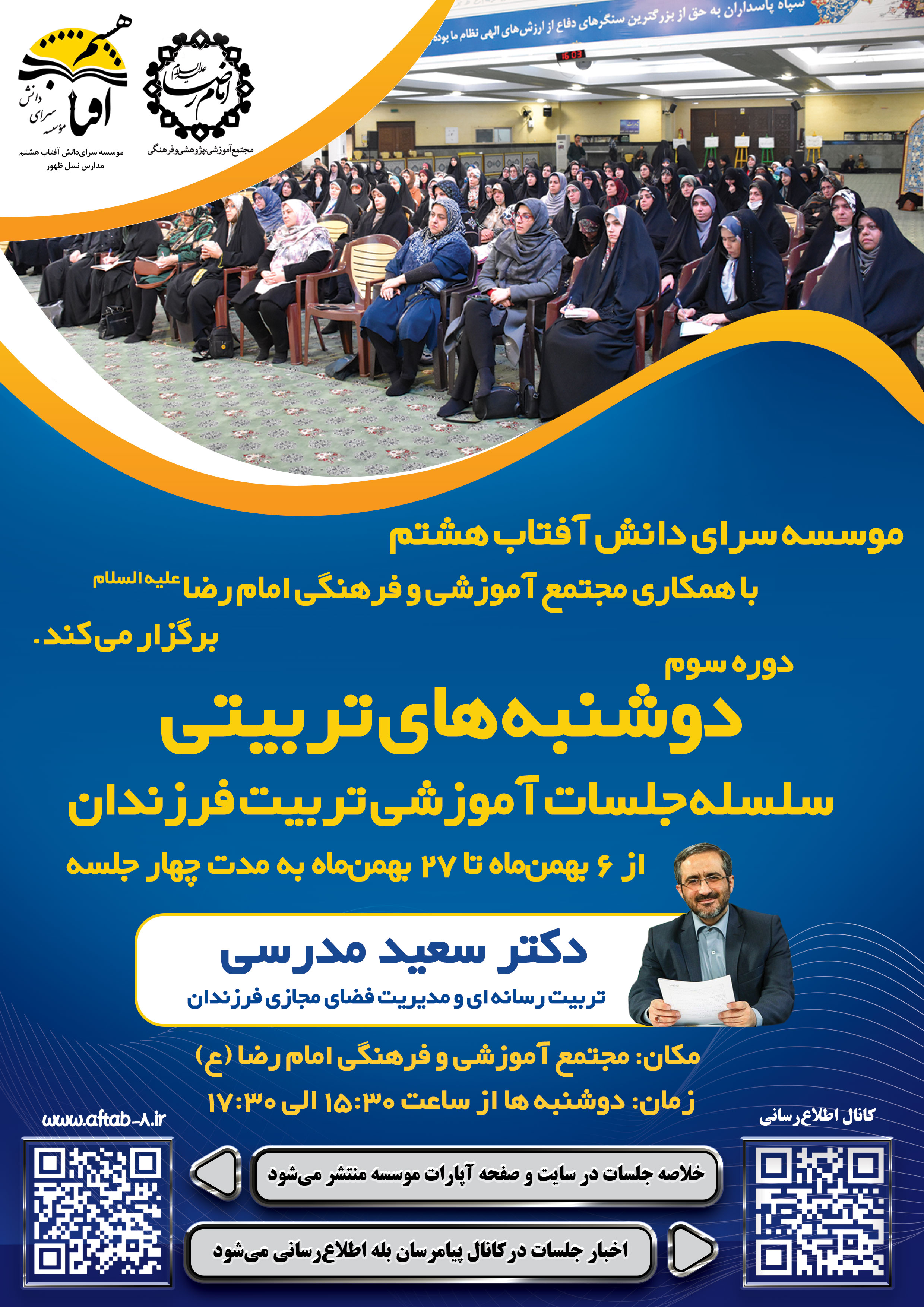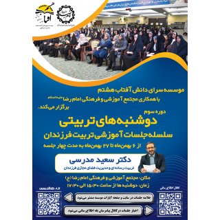 موسسه سرای دانش آفتاب هشتم با افتخار از همه پدران و مادرانی که به تربیت رسانهای فرزندانشان اهمیت میدهند، دعوت مینماید تا در دوره سوم سلسله جلسات آموزشی تربیت فرزندان (دوشنبههای تربیتی) با حضور ارزشمند جناب آقای دکتر سعید مدرسی با موضوع تربیت رسانهای و مدیریت فضای مجازی فرزندان شرکت فرمایید.